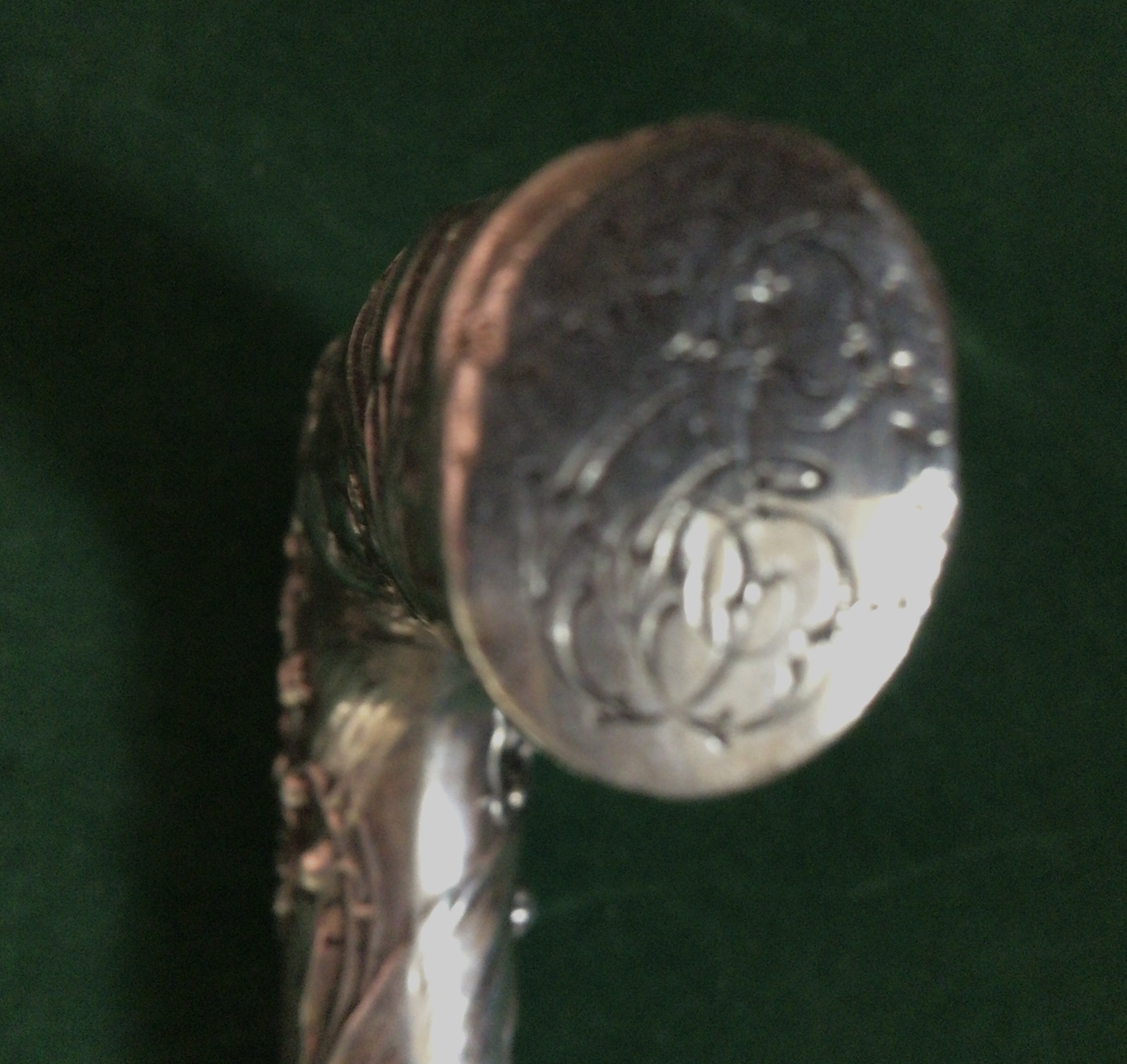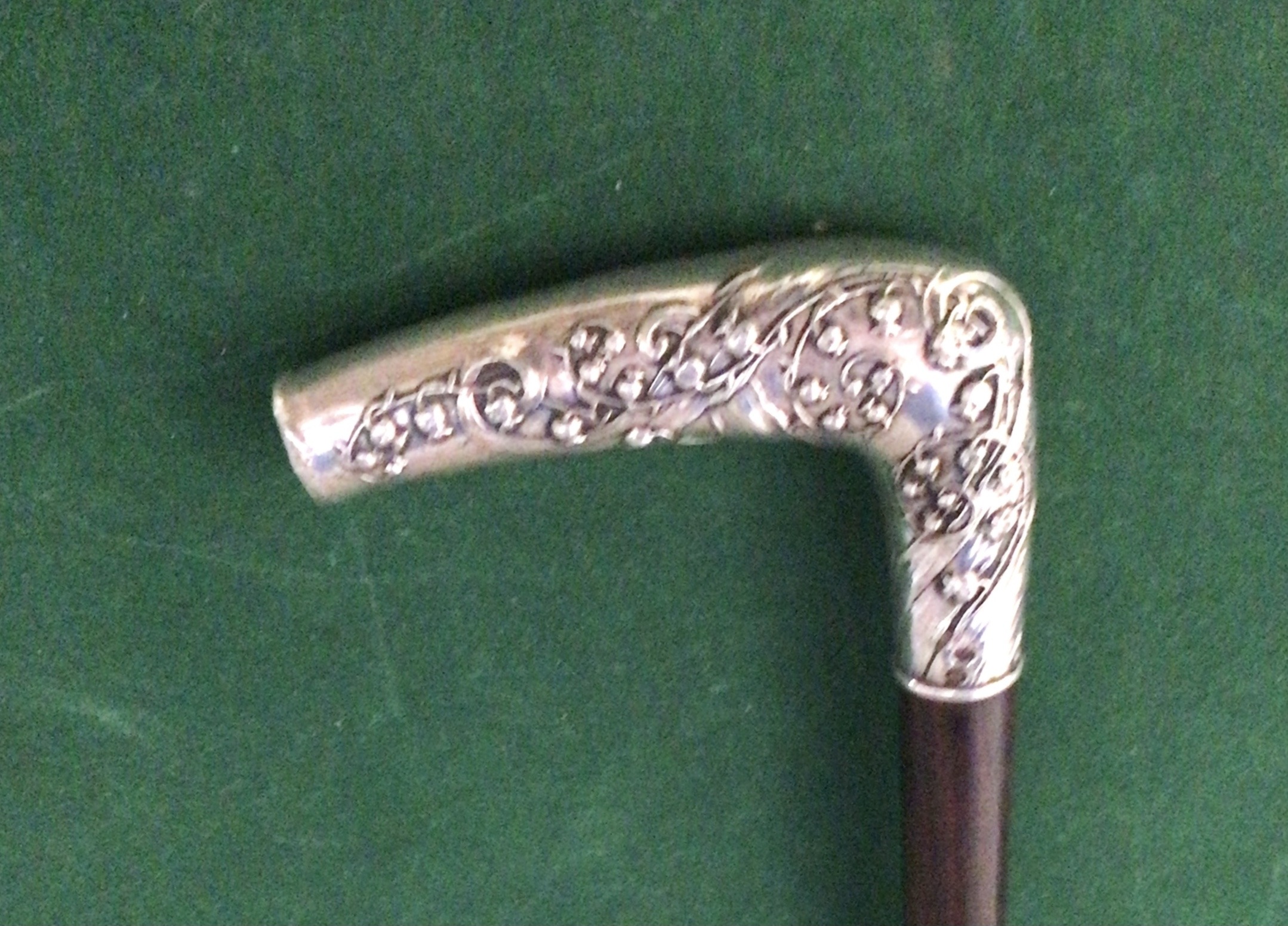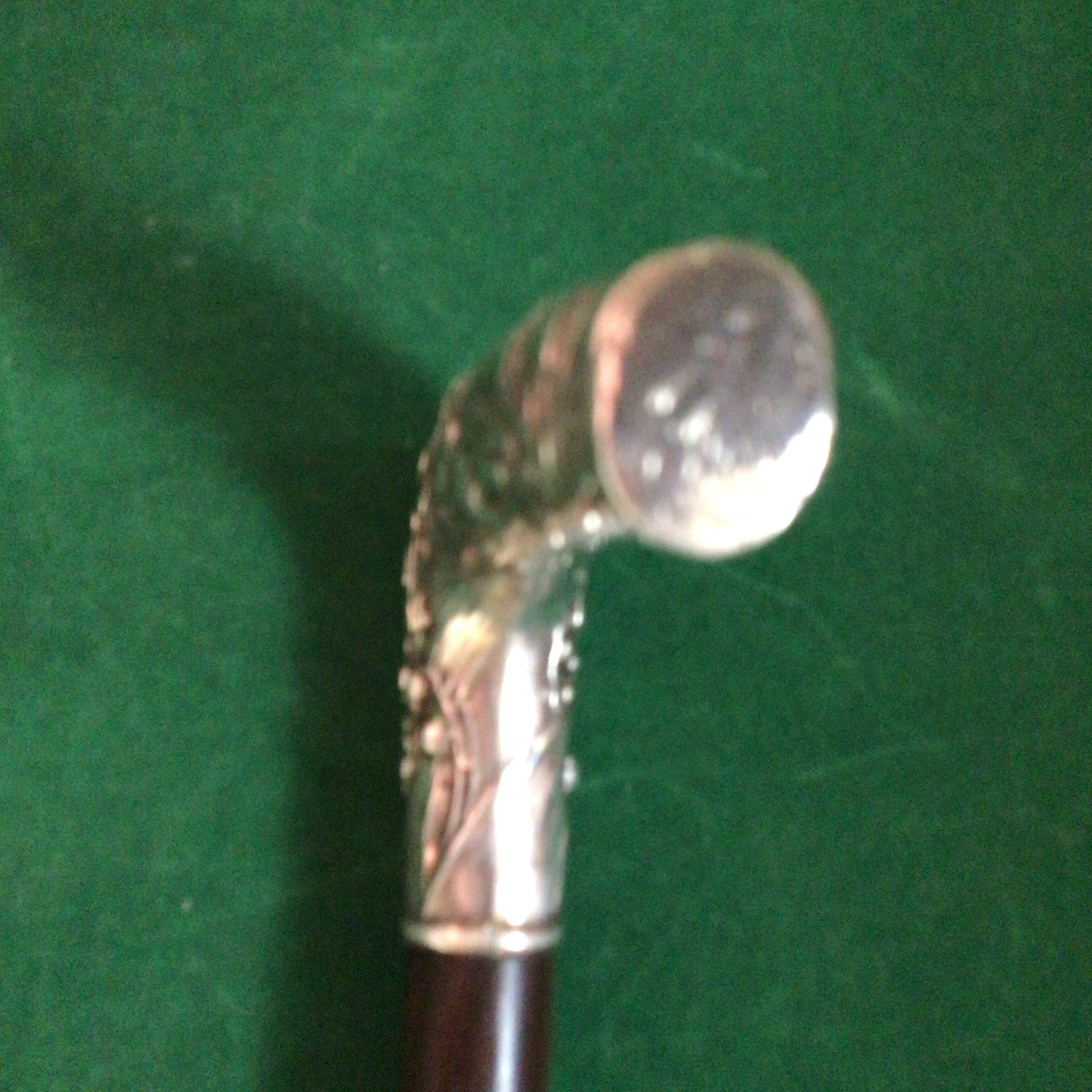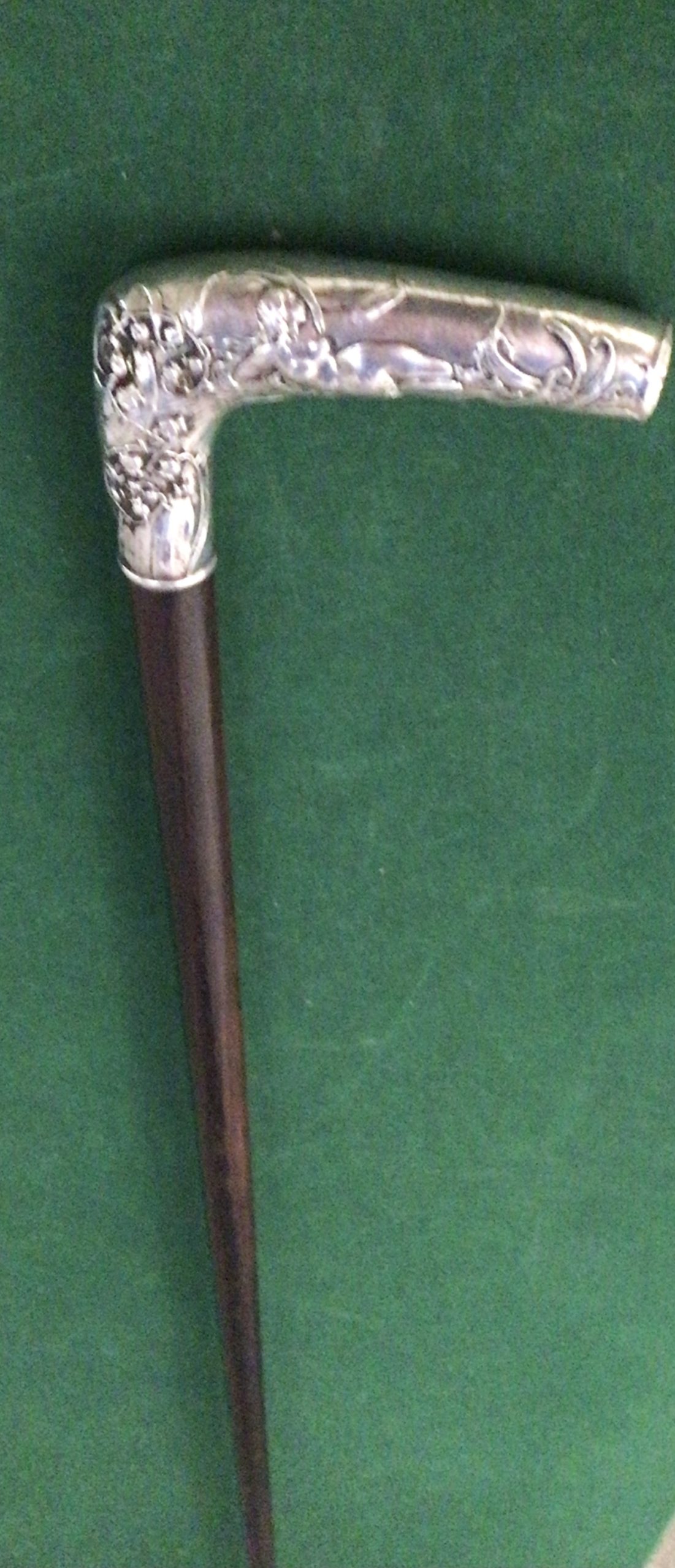 Canne érotique - poignée équerre en argent - décors femme nue allongée avec décors fleuris - fût en bois dur teinté de noir - férule en fer blanc - époque 1900 - longueur 86 cm