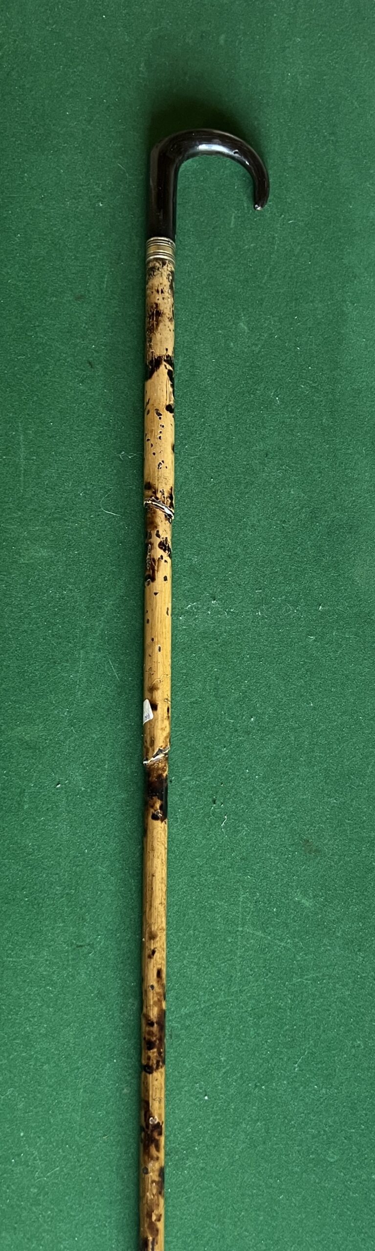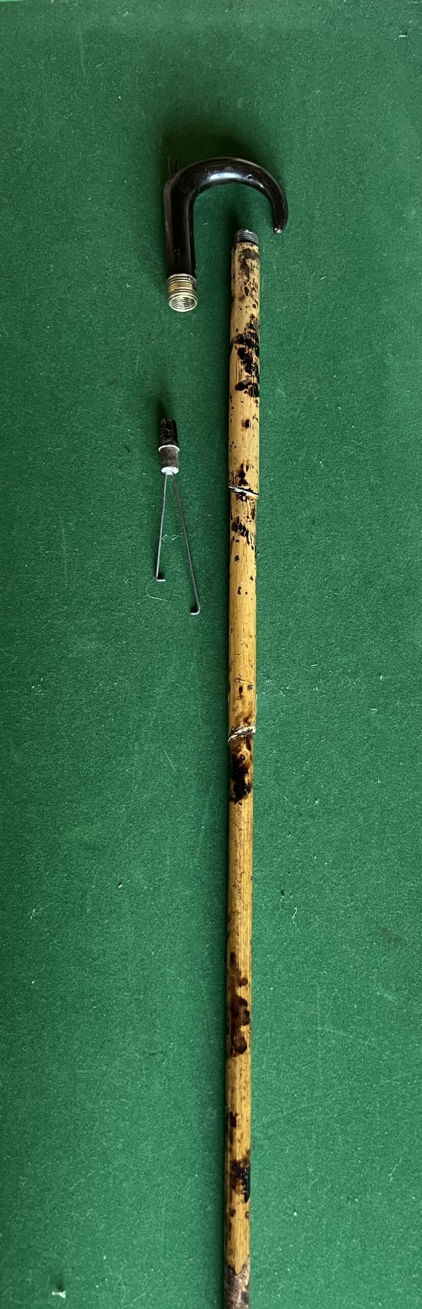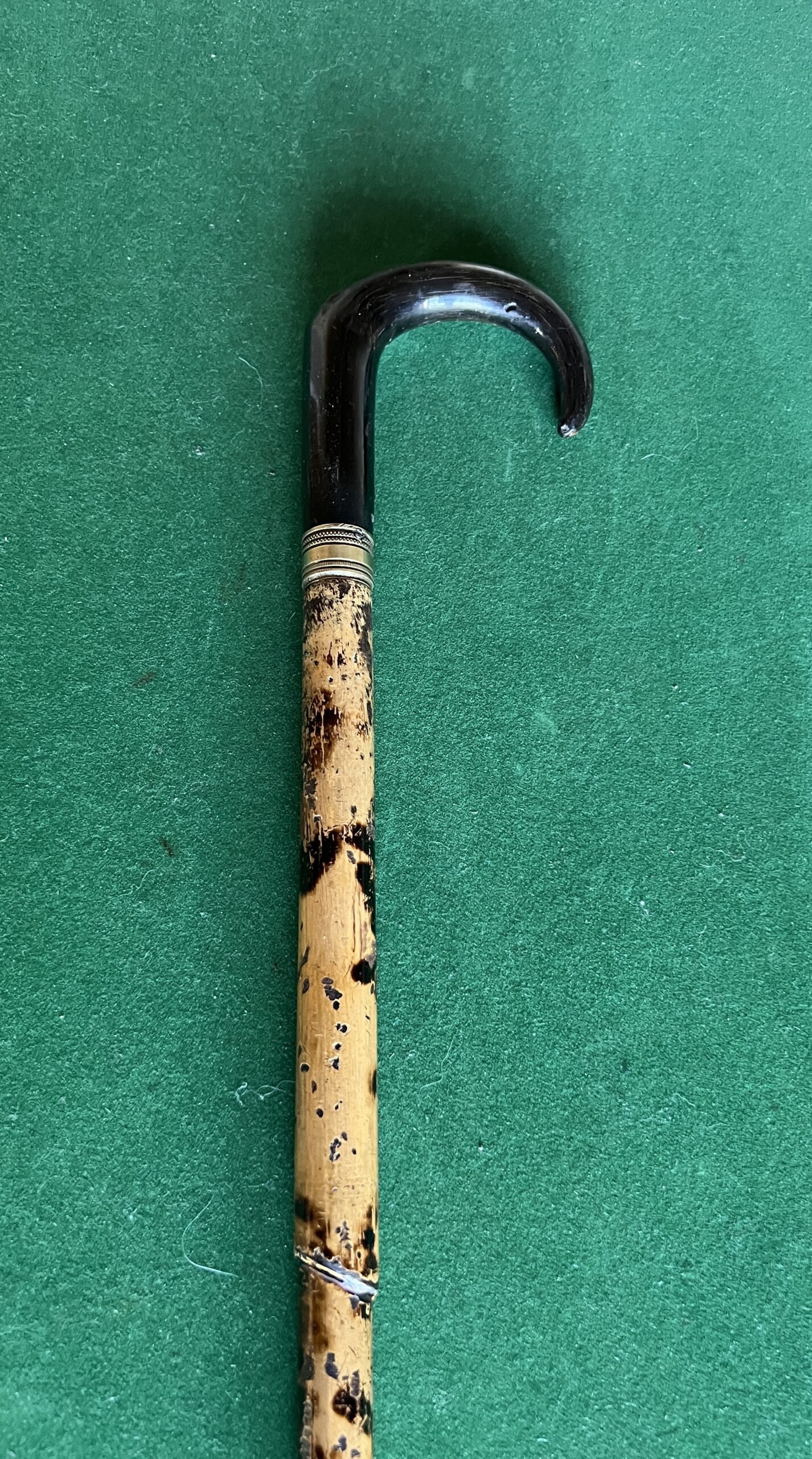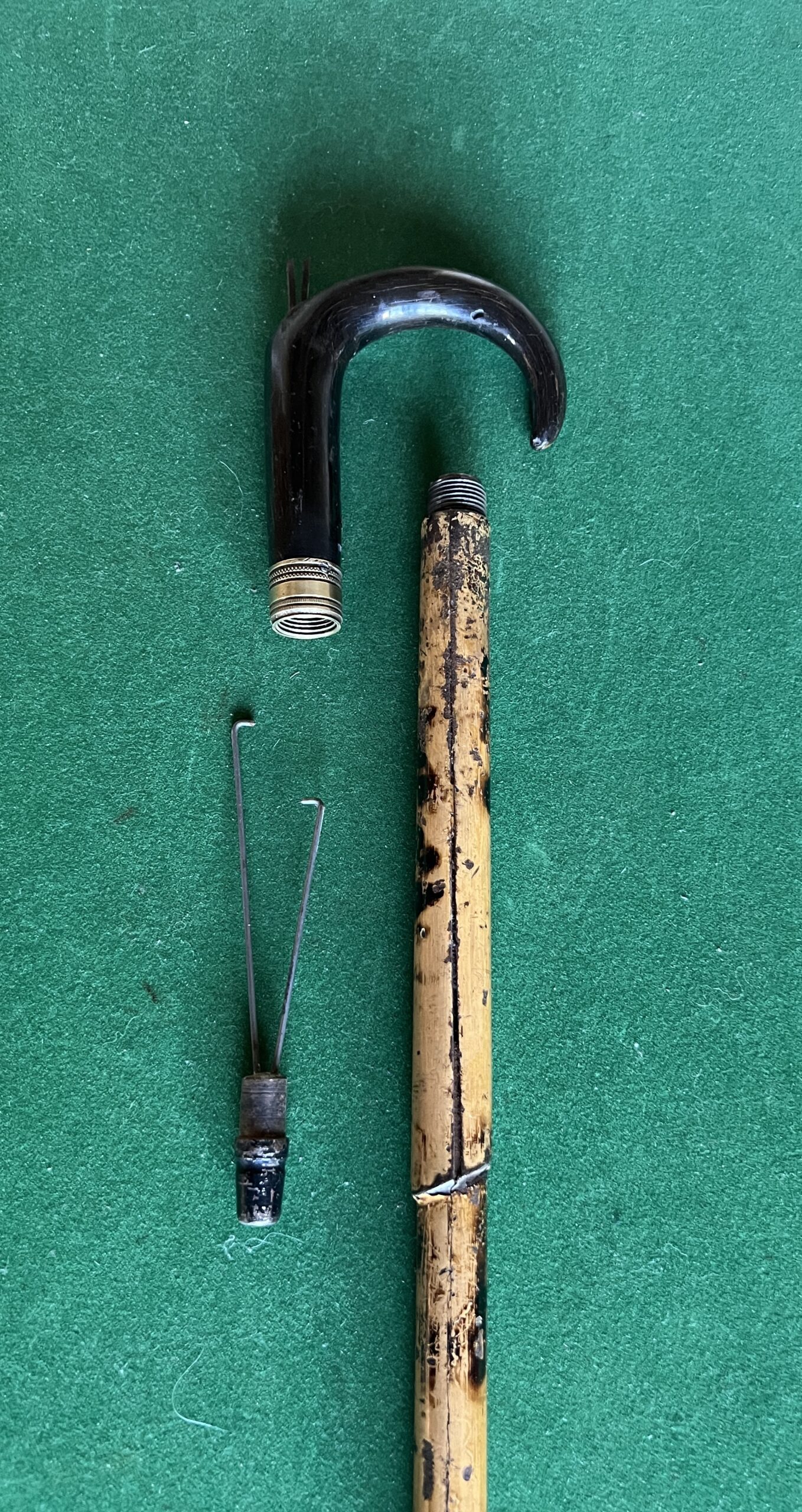 Le pommeau est en corne noire - la bague est en fer blanc - le fût est en métal imitation bambou - la férule en métal permet de tirer la gâchette qui se trouve à l’arrière de la poignée - la longueur est de 90 cm - époque fin 19 ieme -