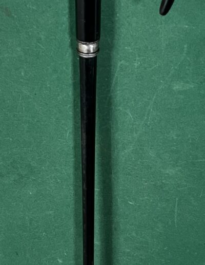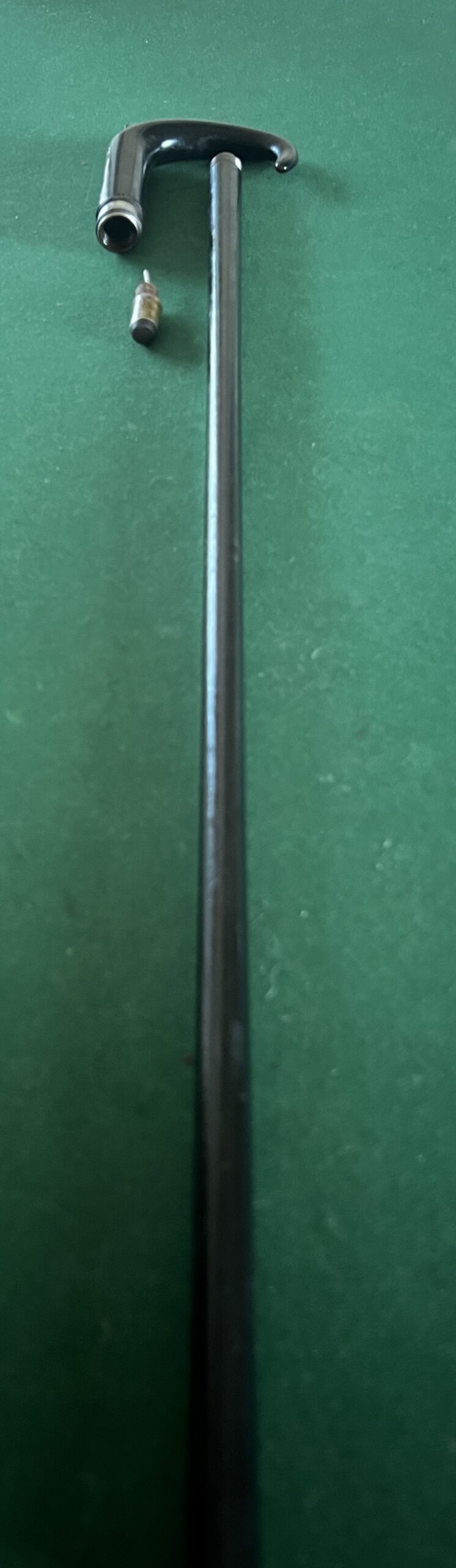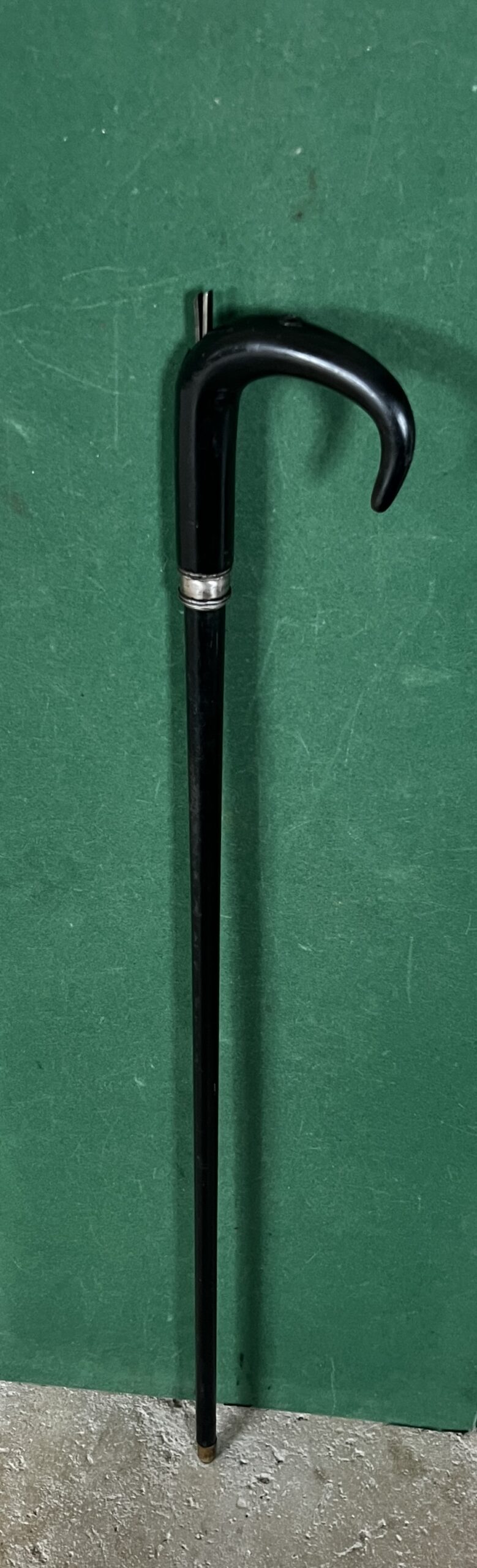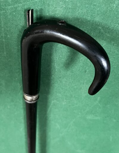 Le pommeau corbin est en corne noire - la bague est en acier - le fût qui sert de canon est en acier laqué noir - la férule en fer blanc et talon en acier - la longueur est de 87 cm - époque fin dix-neuvième -