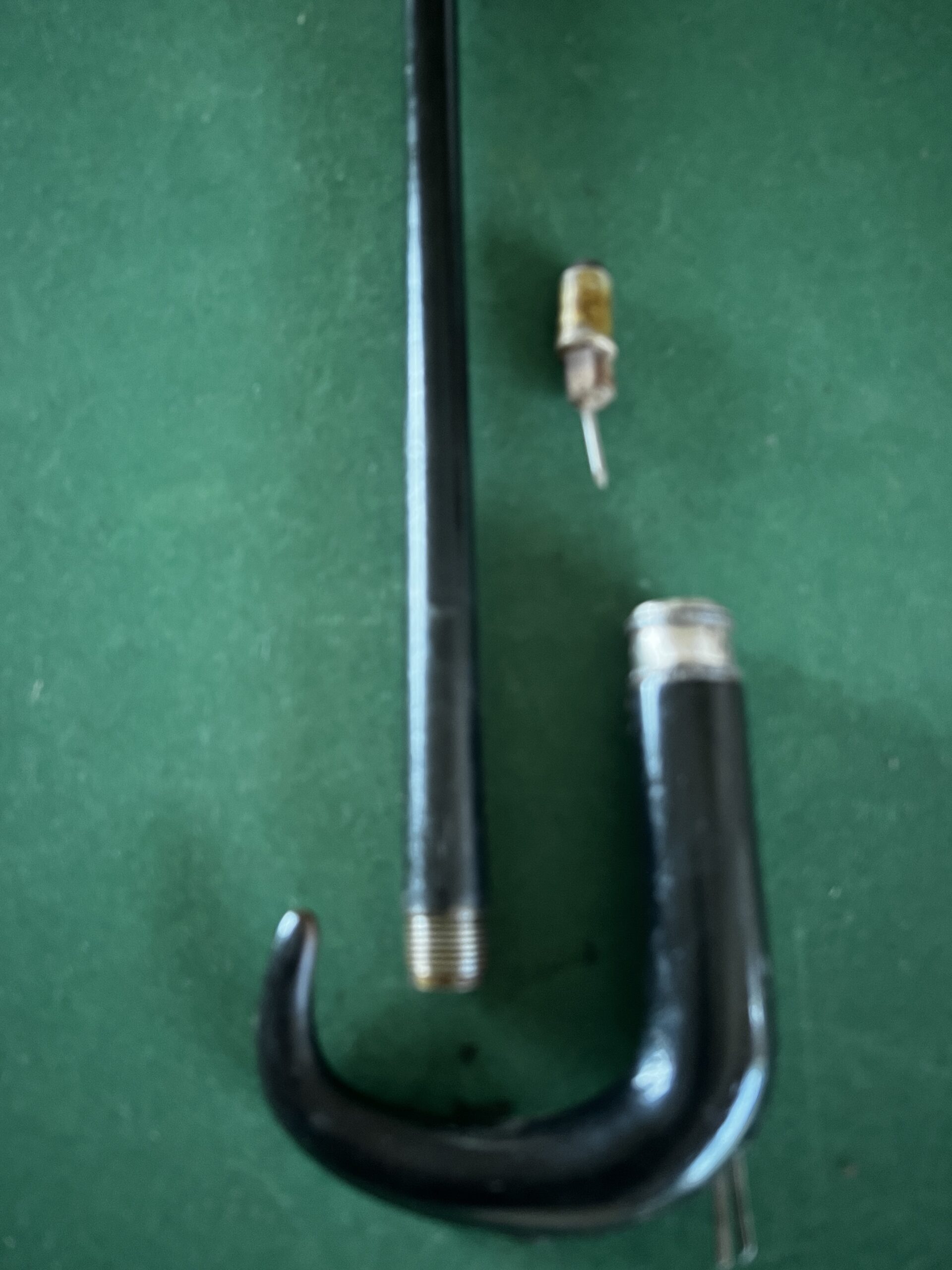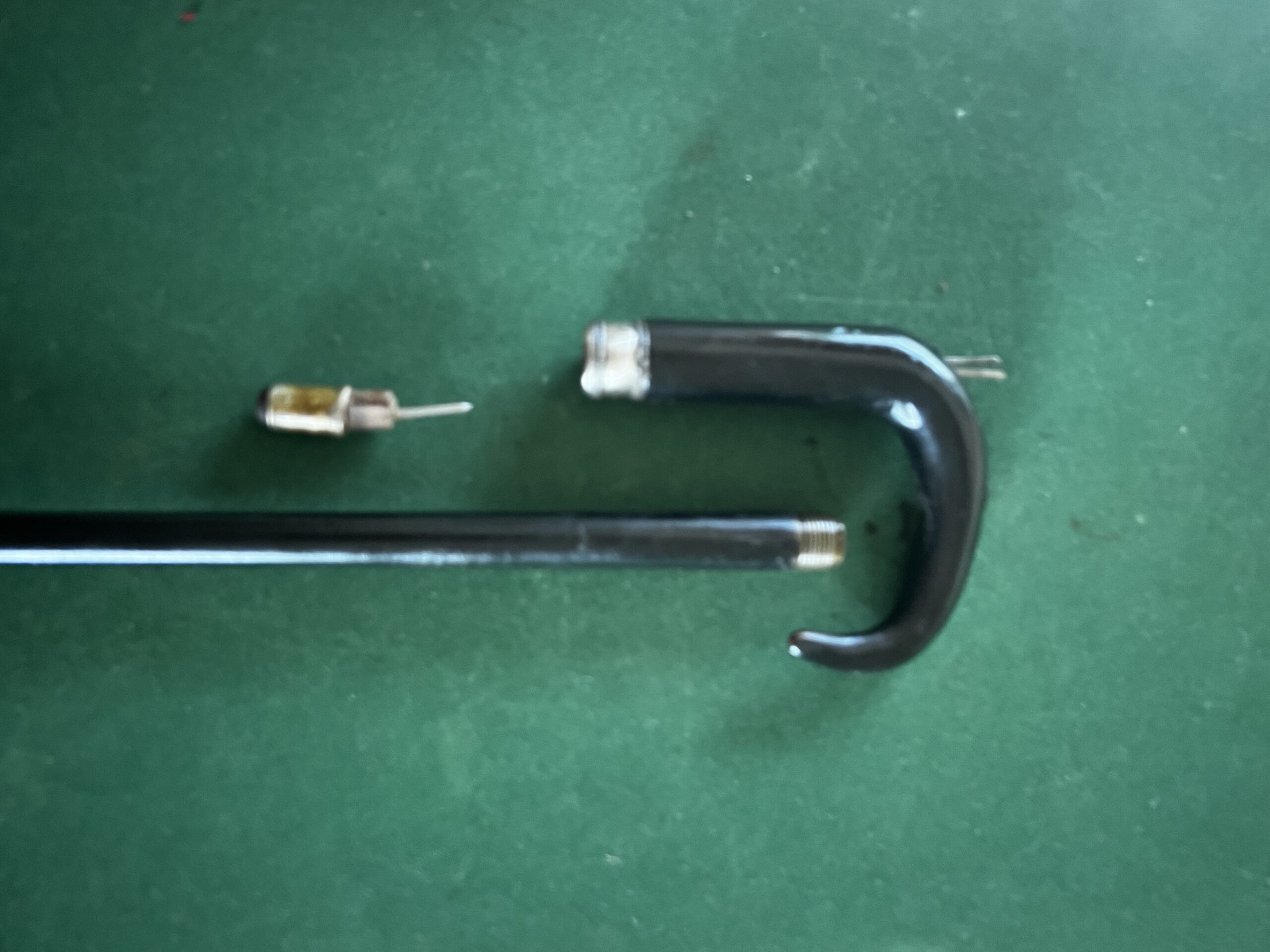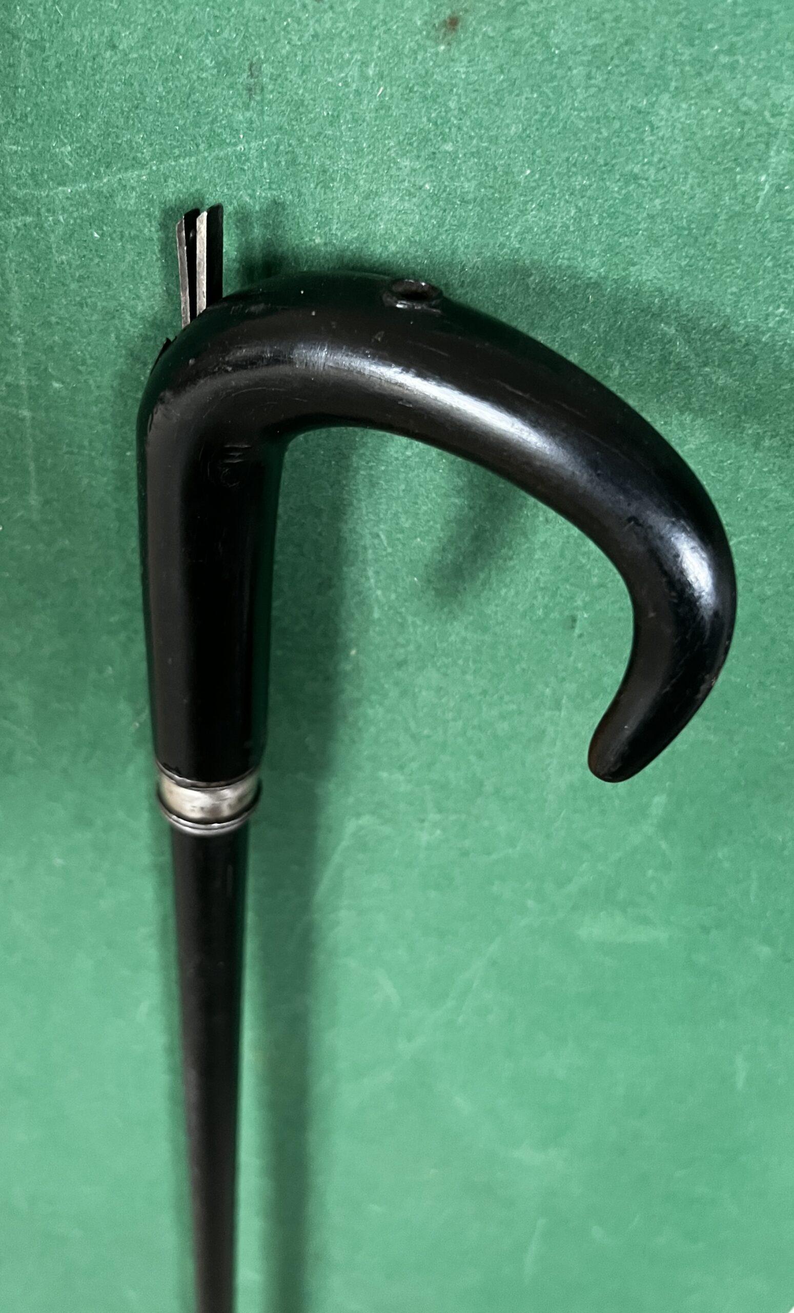 Le pommeau corbin est en corne noire - la bague est en acier - le fût qui sert de canon est en acier laqué noir - la férule en fer blanc et talon en acier - la longueur est de 87 cm - époque fin dix-neuvième -