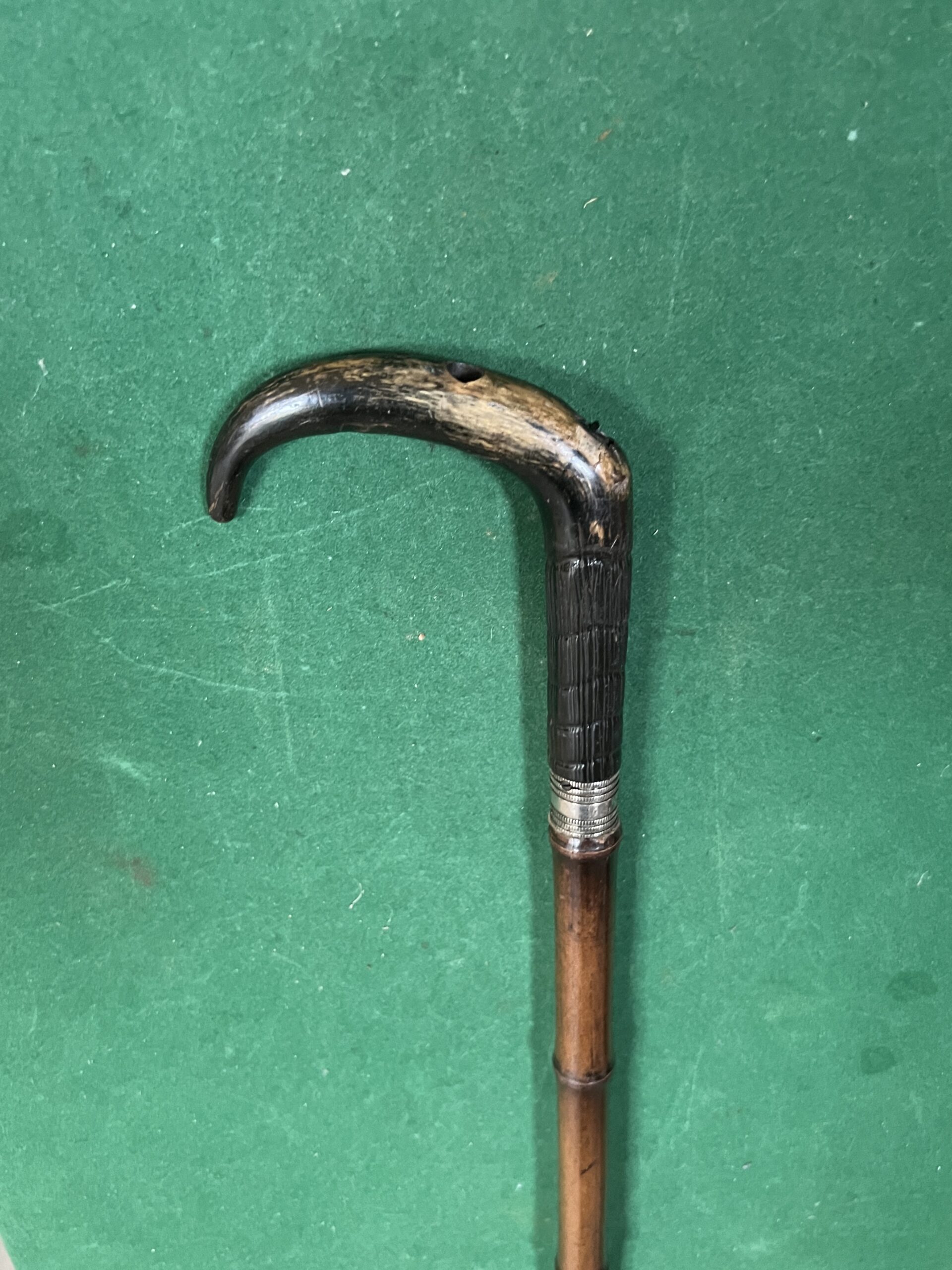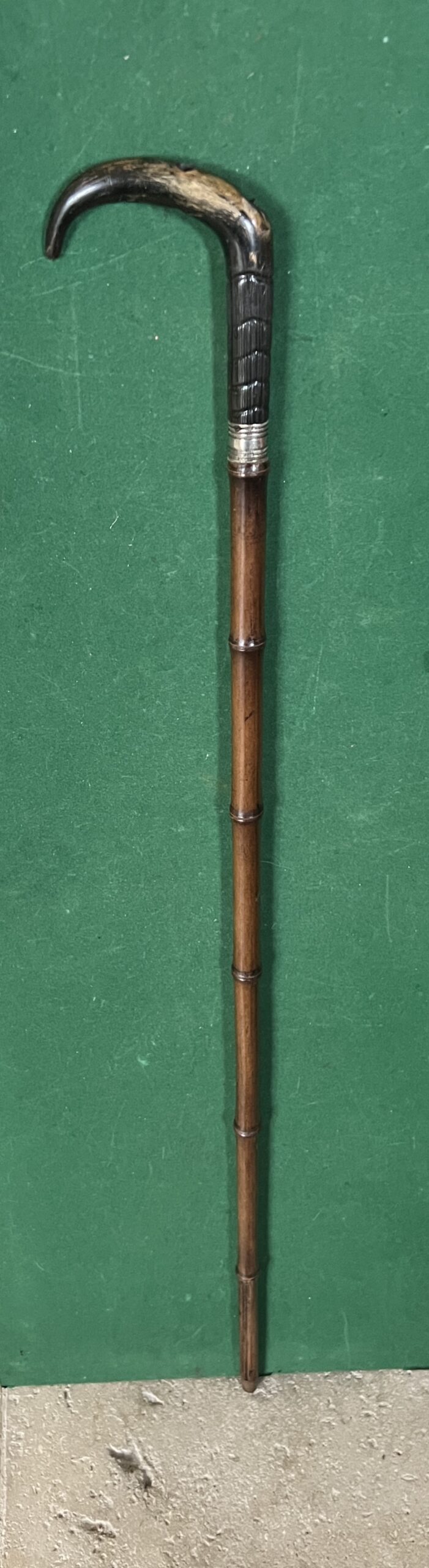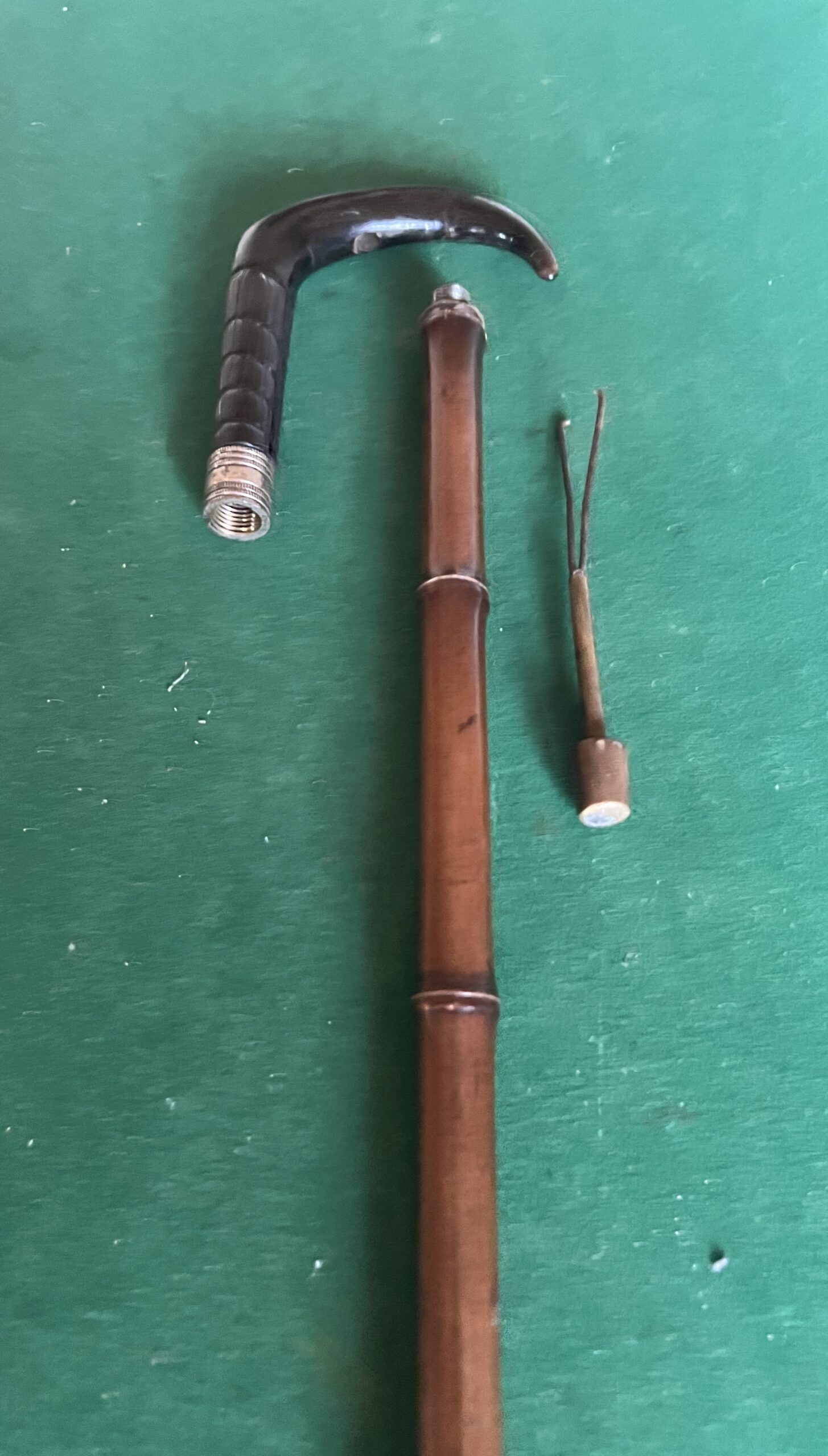 Le pommeau est en corne - la gâchette que l’on tire est sur le dessus du la poignée - la bague est en métal - le fût en bambou - la férule qui sert pour charger est en cuivre - la longueur est de 91 cm - époque fin 19 ieme