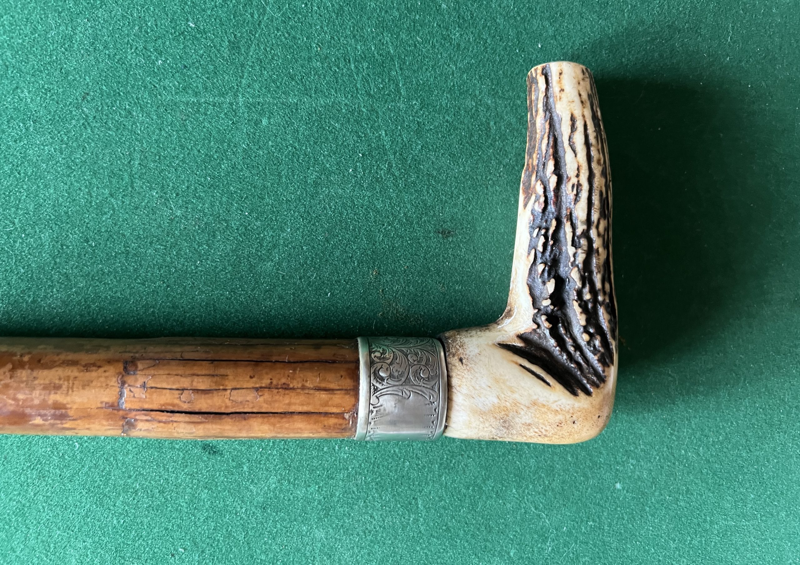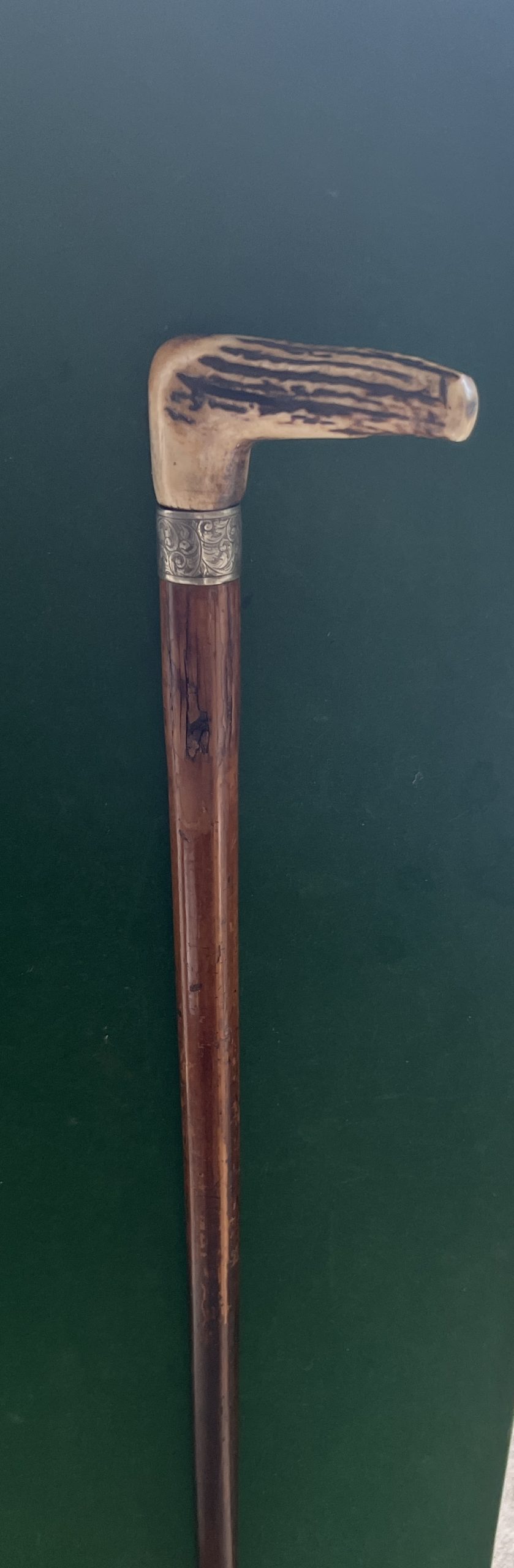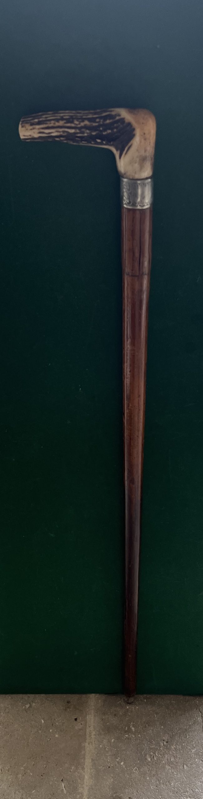 La poignée est en Endoullet ( corne de cerf ) la bague est sûrement en argent - le fût est en malaka - la férule est en fer blanc et acier / longueur 91 cm - fermeture dans sont jus - époque 1890 -