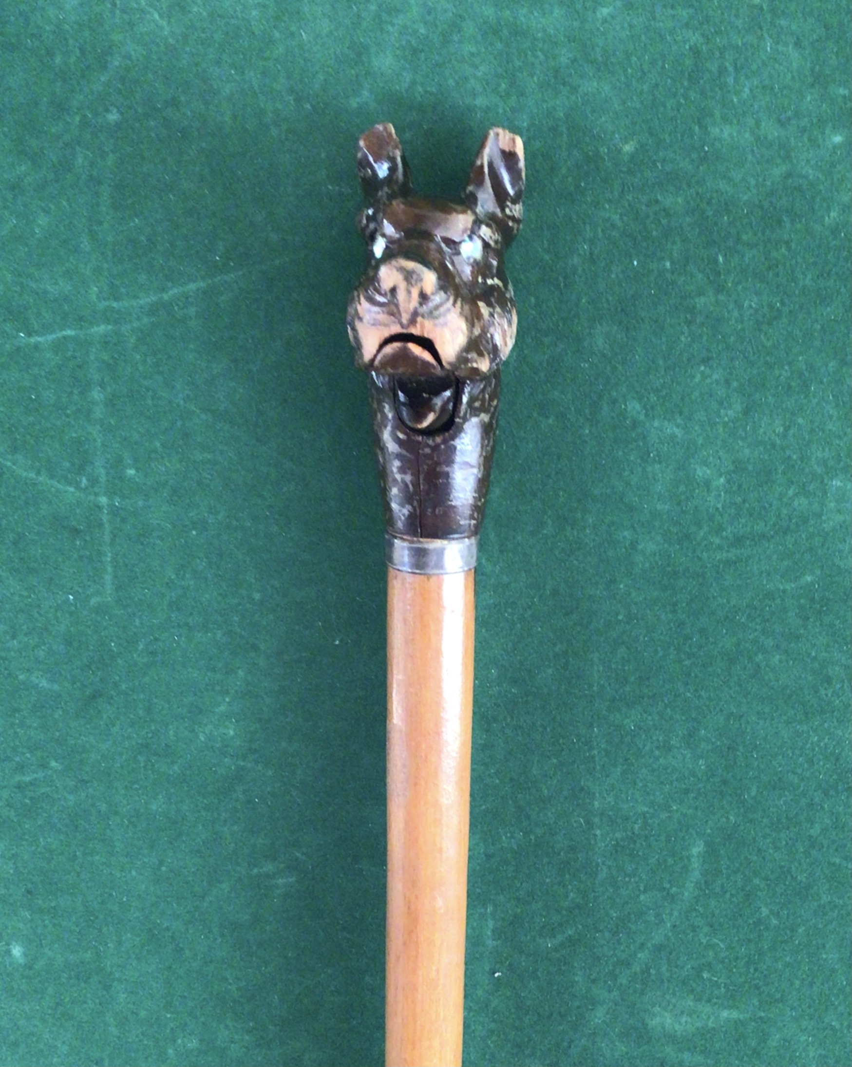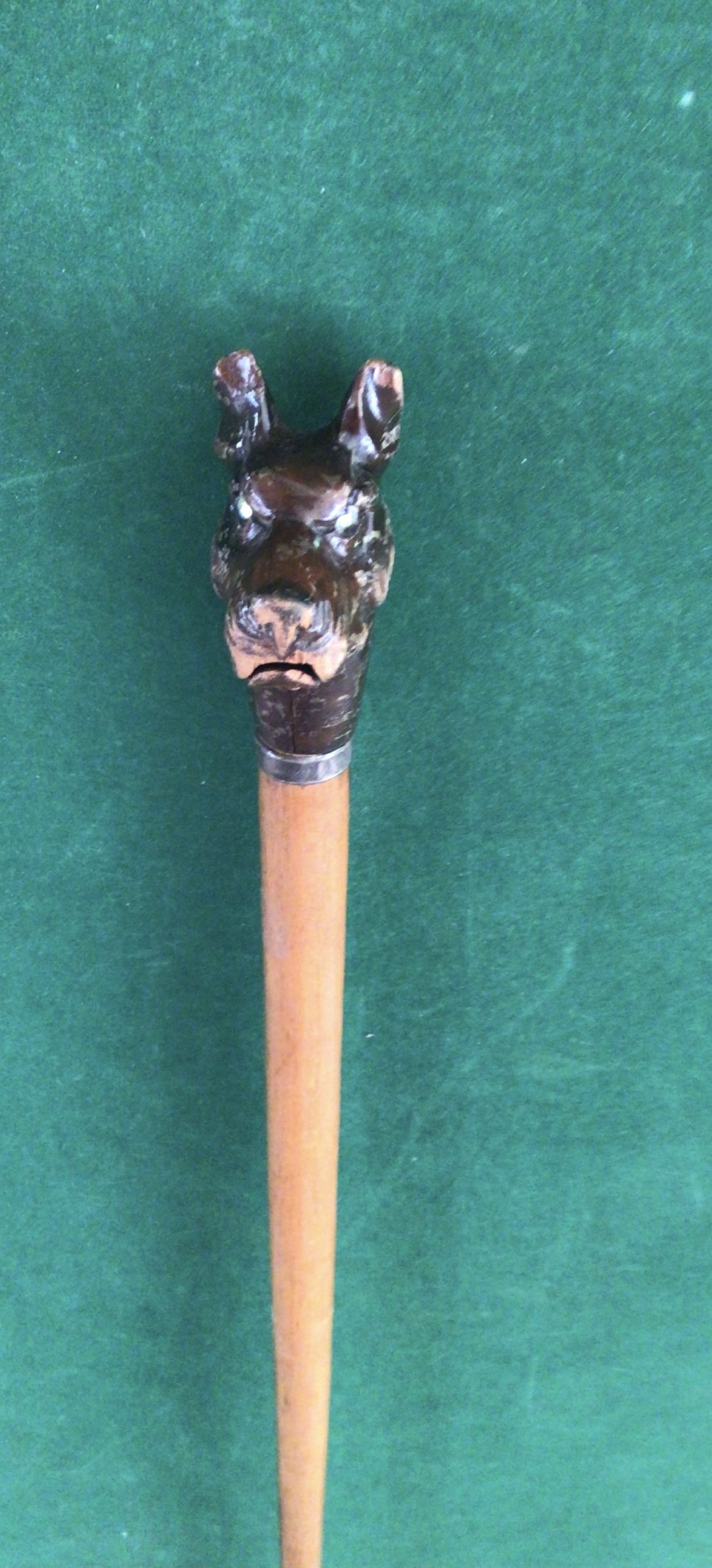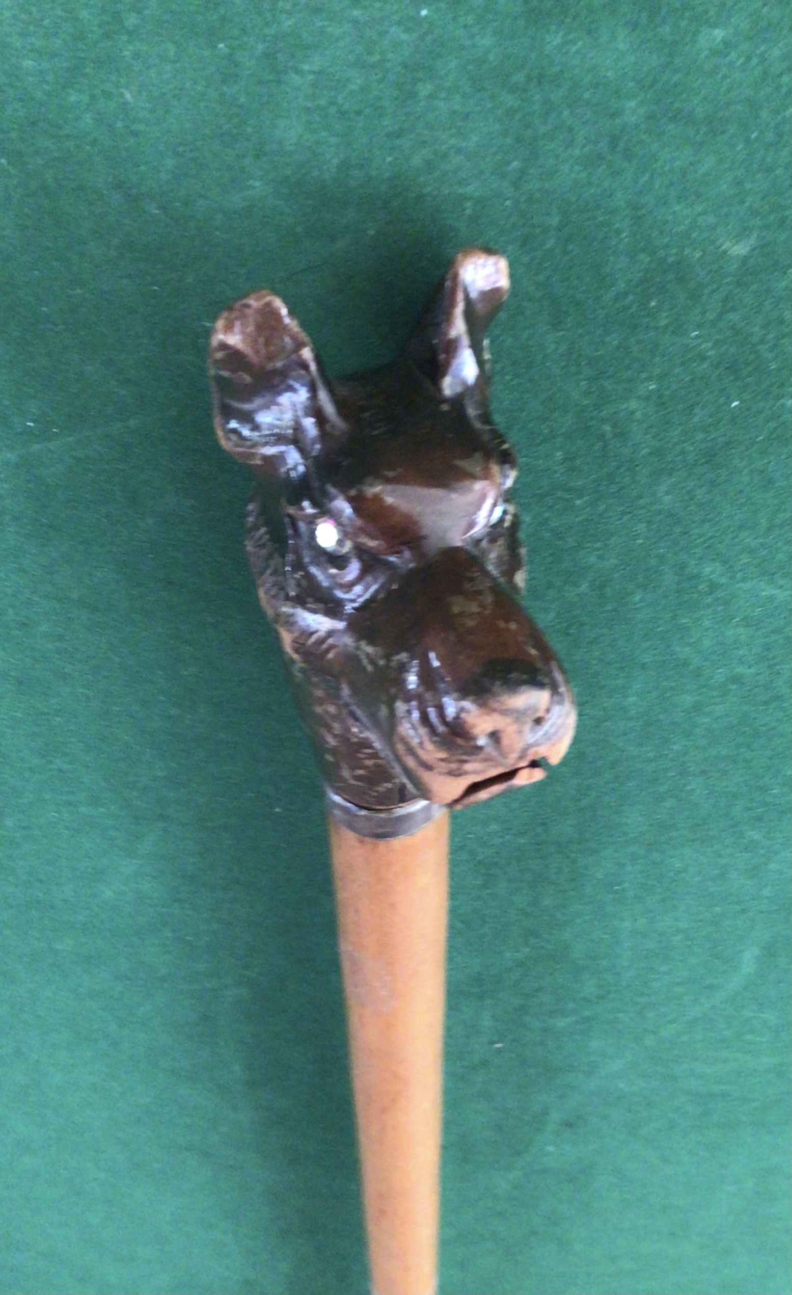 Canne à système porte gants - tête de chien danois - férule bois peinte en noir - longueur 90 cm - prix 180€00